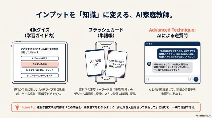 「読む」学習から、「聴く」「観る」学習へ。NotebookLMは、インプットの常識を覆すツールなのです。