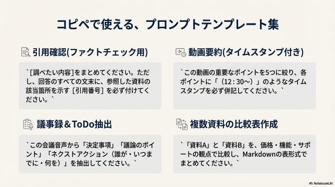 最後に、NotebookLMの実力を120%引き出すための「そのまま使えるプロンプト(指示書)」を紹介します。これらをコピペして、自分の状況に合わせて少し書き換えるだけで、プロ級のアウトプットが得られます。