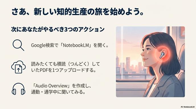 - STEP 3:「音声ガイド(Audio Overview)」を作成し、通勤・通学中に聞いてみる