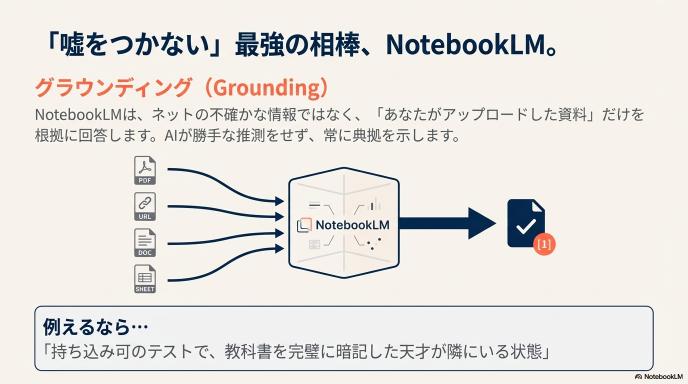 これまでのAI(ChatGPTなど)は、ネット上のあらゆる情報を学習しているため、たまに「もっともらしい嘘(ハルシネーション)」をつくことがありました。しかし、NotebookLMは違います。