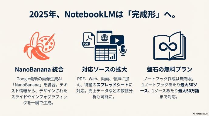 かつて「PDFを要約してくれる便利なメモ帳」として登場したこのツールは、NanoBananaの統合やGeminiとの連携によって、「資料を読み込み、理解し、さらにスライドや動画という形にしてアウトプットする」という、創造的な領域まで足を踏み入れました。