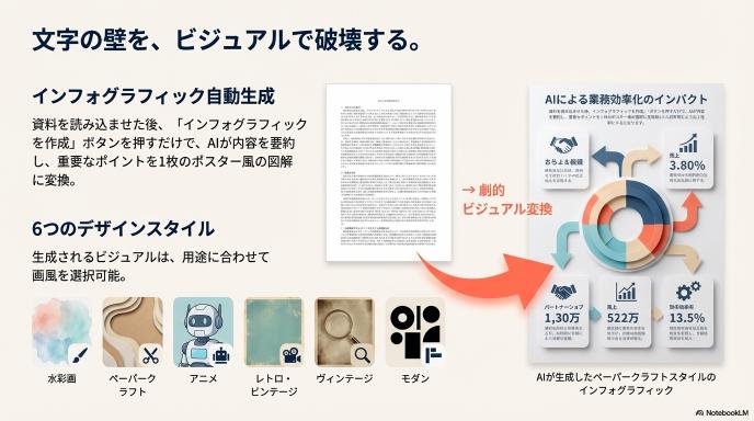 AIが内容を要約し、重要なポイントを「1枚のポスター風の図解」にまとめてくれます。例えば、歴史の教科書データを入れると、年表と出来事をイラスト付きで整理してくれたり、製品のマニュアルを入れると、使い方の手順を図解してくれたりします。要点を「絵」で掴んでから本文を読むことで、理解スピードが爆上がりします。