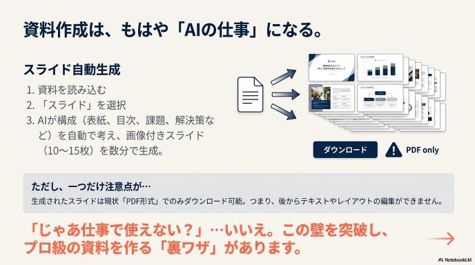 ここで一つだけ注意点があります。 NotebookLM上で作ったスライドは、現状「PDF形式」でしかダウンロードできません。つまり、後から文字を直したり、画像の配置を変えたりといった「編集」ができないのです。