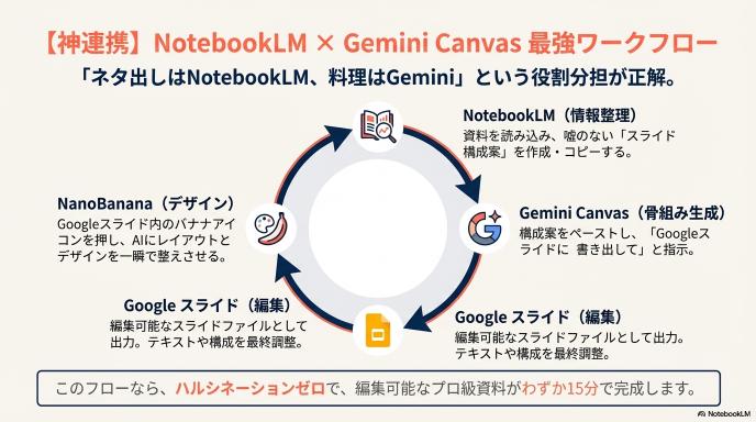 ここが今回一番伝えたい「裏ワザ」です。NotebookLMの正確さと、Googleの生成AI「Gemini」の創造性を組み合わせることで、最強の資料作成ワークフローが完成します。