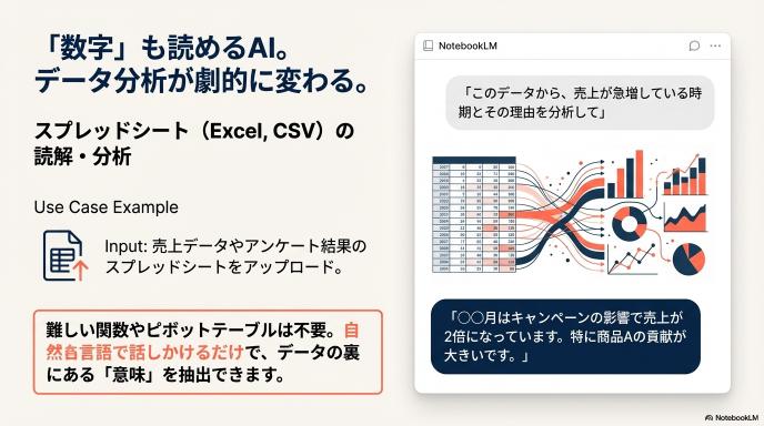 これまでNotebookLMは「文章」を読むのが得意でしたが、ついに「数字」も読めるようになりました。ExcelやGoogleスプレッドシートを読み込ませることで、専属のデータアナリストを雇ったかのような分析が可能になります。