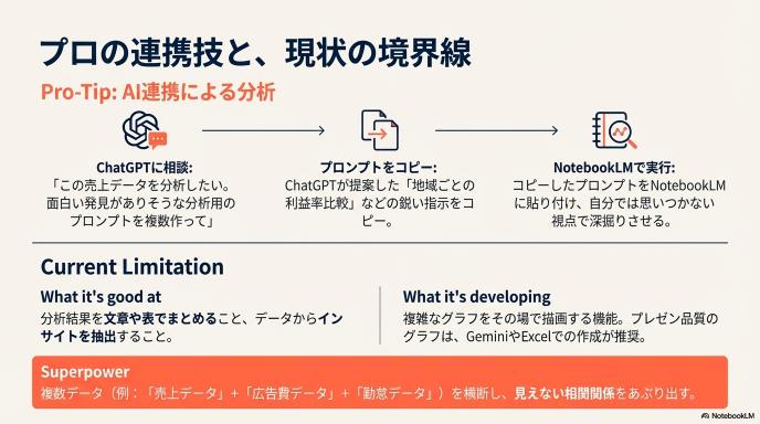 ここで、AI活用のプロがやっている「連携技」を紹介します。 いきなりNotebookLMに分析させるのではなく、まずChatGPTに相談するのです。