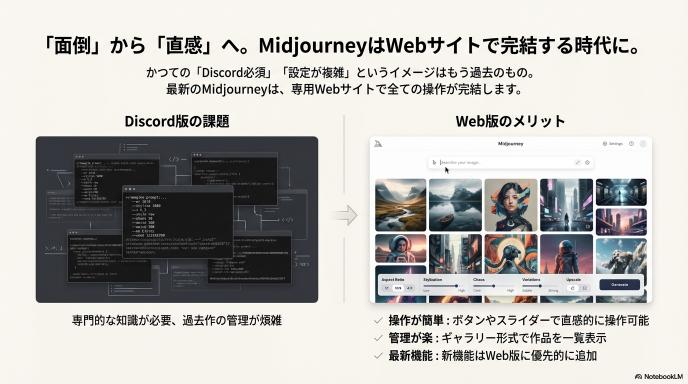 そんな心配はもう不要です! 最新のMidjourneyは専用のWebサイト(ブラウザ)から、まるでスマホゲームのように直感的に操作できるようになりました。