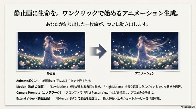 画像の右下にある「Animate(動画化)」ボタンを押すだけ。