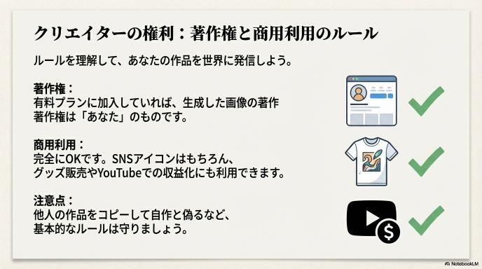 有料プラン(Basic以上)に加入していれば、Midjourneyで作った画像の著作権はあなたのものです。 SNSのアイコンにするのはもちろん、グッズにして販売したり、YouTubeのサムネイルに使って収益を得たりする「商用利用」もOKです。 ただし、他人の作品をそのままコピーして「自分が描いた」と言うのはNG。ルールを守って楽しく使いましょう。