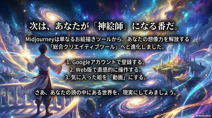 Midjourneyは単なる「お絵描きツール」から、「総合クリエイティブツール」へと進化しました。 絵が描けなくても、Webサイトでポチポチ操作するだけで、プロ顔負けのイラスト、アニメーション、ロゴデザインまで作れる時代です。