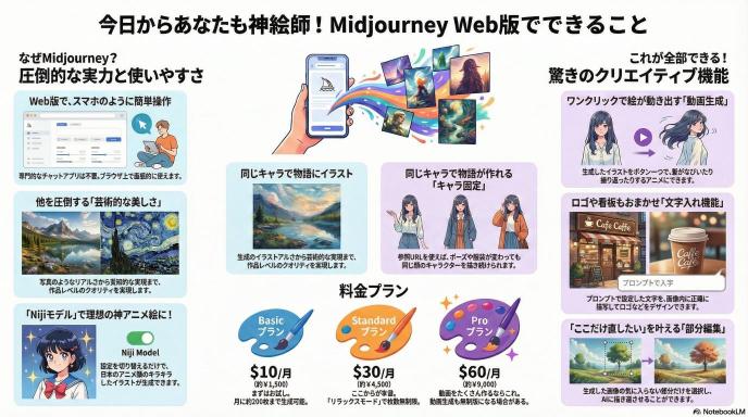「自分の頭の中にあるイメージを、そのまま絵にできたらなぁ…」 そう思ったことはありませんか? 絵心がなくても、高い画材がなくても大丈夫。今、世界中で話題のAIツール「Midjourney(ミッドジャーニー)」を使えば、誰でも一瞬で「神絵師」になれる時代が来ました。