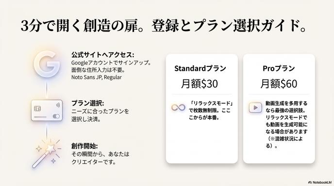 - Standardプラン(月額30ドル): ここからが本番。 「リラックスモード」を使えば、生成スピードは落ちますが枚数無制限で作れます。