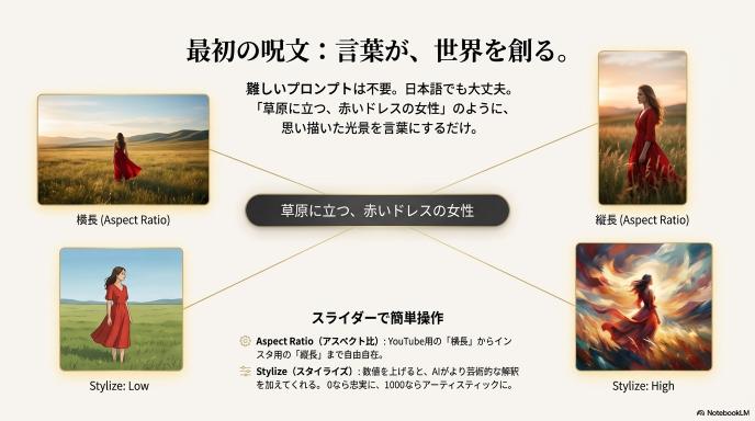 - Stylize(スタイライズ): 数値を上げると、AIが勝手に芸術的に盛ってくれます。0なら指示通り忠実に、1000ならアーティスティックに。