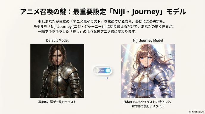 ここが最初の重要ポイント! もしあなたが「日本のアニメ風イラスト」を描きたいなら、設定画面でモデルを「Niji Journey(ニジ・ジャーニー)」に切り替えましょう。 通常モードだと少し洋ゲー風の絵になりがちですが、Nijiモードにした瞬間、「推し」のようなキラキラしたアニメ絵が生成されるようになります。