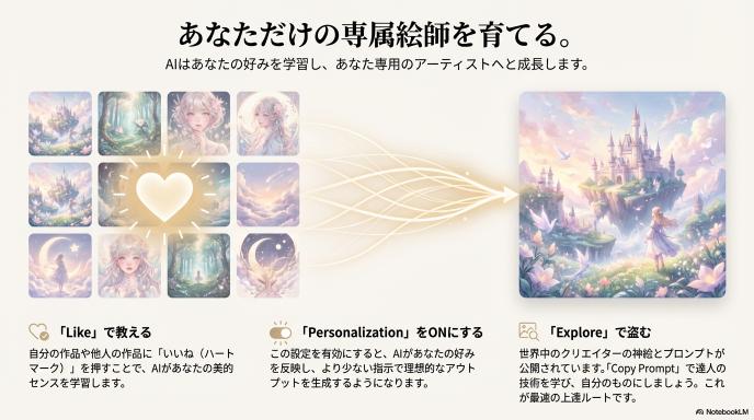 他の人の画像や自分の生成結果に「いいね(ハートマーク)」を押していくと、AIがあなたの好みを学習します。 設定で「Personalization(パーソナライズ)」をオンにすると、プロンプトが適当でも、あなた好みの画風や色使いで出力してくれるようになります。まさに自分専用のAI専属絵師!