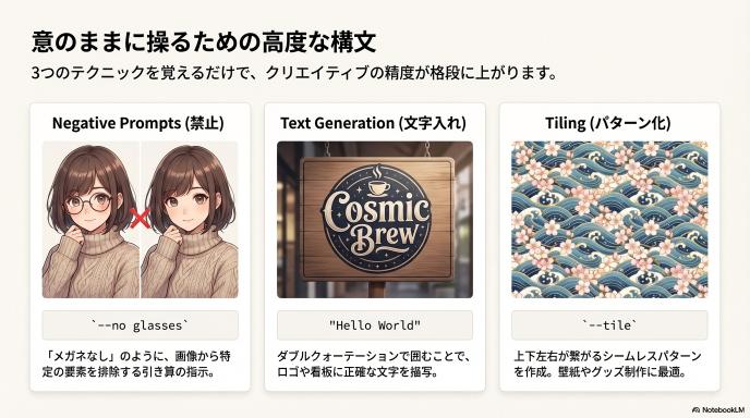 「メガネをかけさせたくないのに、勝手にかけてくる…」そんな時は引き算の指示をします。 パラメータ設定の「No」欄、もしくはプロンプトに --no glasses(メガネなし)や --no text(文字なし)と入れるだけで、AIに「禁止事項」を伝えられます。