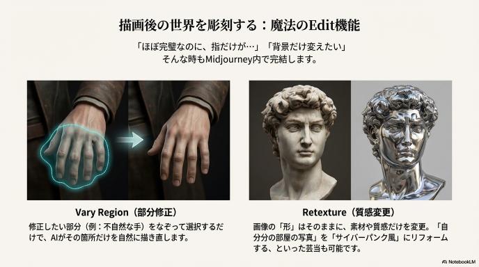 「Vary Region(領域変更)」機能を使います。直したい部分(例:変な形になった手)をなぞって選択し、再度生成ボタンを押すと、その部分だけをAIが描き直してくれます。