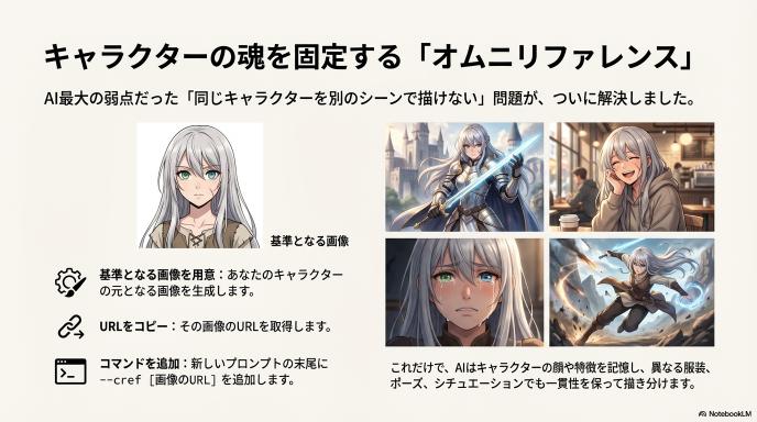 生成したいプロンプトの後に、元となるキャラクター画像のURLを貼り付け、「–cref(キャラクター参照)」というタグを付けるだけ。これでAIが「このキャラを描けばいいのね!」と理解し、別のポーズや服装でも同じ顔で描いてくれます。