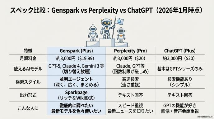| 特徴 | Genspark (Plus) | Perplexity (Pro) | ChatGPT (Plus) |