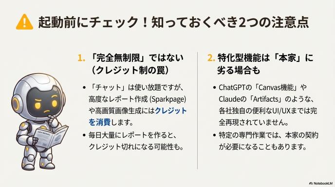 例えば、ChatGPTの「Canvas機能」や、Claudeの「Artifacts」のような、各社独自の便利なUI/UXまでは完全に再現されていません。