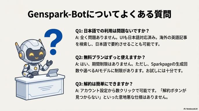 A. はい、期間制限はありません。ただし、1日に生成できるSparkpageの回数や、選べるAIモデルに制限がかかる場合があります。「まずは使い勝手を知りたい」という分には無料版で十分すぎます。