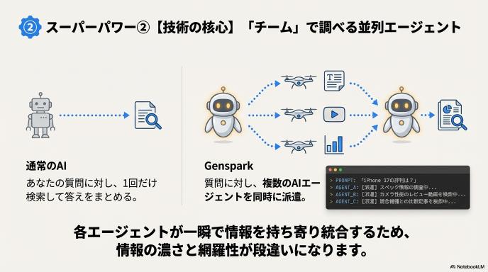 Gensparkが他のAIと決定的に違うのが、この「並列エージェント(Parallel Agents)」という仕組みです。