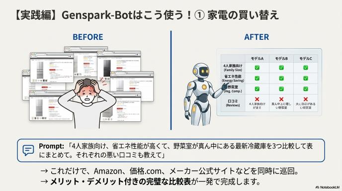 - 普通の検索: 「冷蔵庫 おすすめ 2026」で検索して、比較サイトを3つくらい往復して、スペック表を見比べる…。