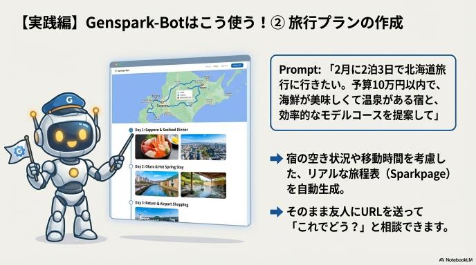 - プロンプト: 「2月に2泊3日で北海道旅行に行きたい。予算10万円以内で、海鮮が美味しくて温泉がある宿と、効率的なモデルコースを提案して」