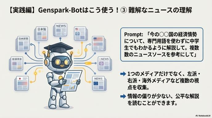 - プロンプト: 「今の〇〇国の経済情勢について、専門用語を使わずに中学生でもわかるように解説して。複数のニュースソースを参考にして」