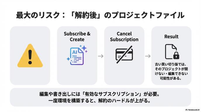 契約中に作成したプロジェクトファイル自体は端末に残りますが、「編集や書き出しには有効なサブスクリプションが必要」となります。