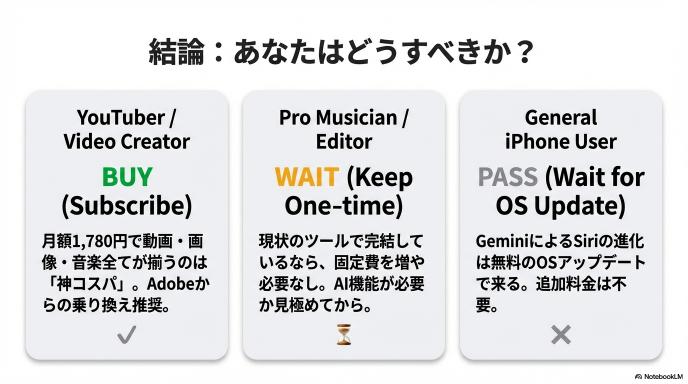 - あなたへの結論: 動画制作者、音楽家、一般ユーザー、それぞれの立場での「最適解」。