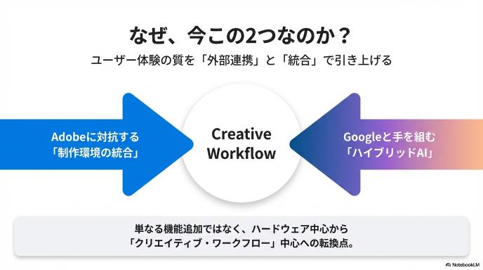 制作環境においては、Adobe Creative Cloudに対抗するようにツール群を統合。AI分野では、自社開発に固執せずGoogleと手を組むことで、実用性を最優先する姿勢を鮮明にしました。
