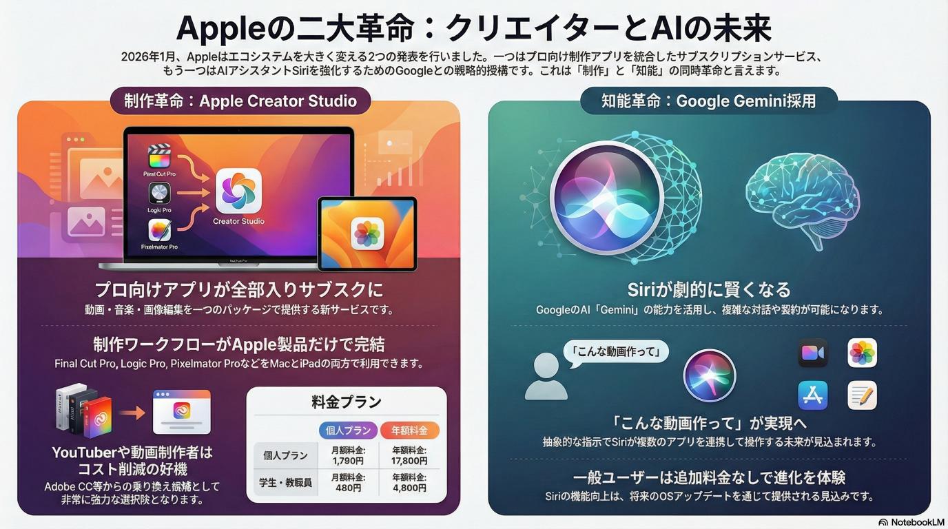 今回の発表は、単なる新プランの追加や機能アップデートではありません。Appleのエコシステムを取り巻く環境において、「クリエイティブなアウトプット」と「それを支えるインテリジェンス」の双方が同時に刷新される、極めて重要な転換点です。