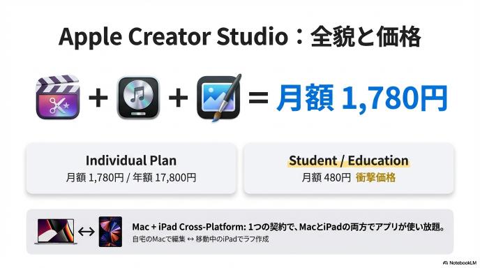 つまり、今回のCreator Studioは既存ユーザーに対する強制的な置き換え(リプレイス)ではなく、新たな選択肢の「追加」です。ただし、iPad版の利用や、常に最新のAI機能をフル活用したい場合は、サブスクリプションへの加入が推奨される設計になっています。