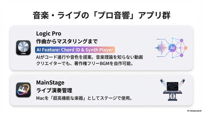 動画編集のFinal Cut Pro、音楽制作のLogic Proに加え、画像編集のPixelmator Pro(iPad版含む)、さらにはモーショングラフィックスやエンコードツールまでを束ねることで、動画・サムネイル・BGM制作をすべてApple純正アプリ内で完結させるワークフローを提案しています。