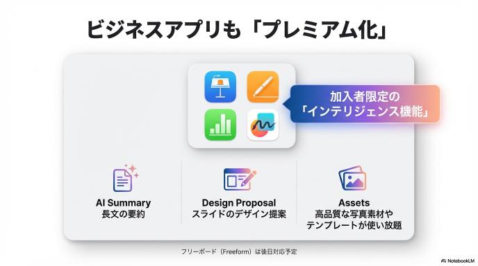これらにおいて、加入者限定の「インテリジェンス機能」と「プレミアムコンテンツ」が解放されます。高品質な写真素材やテンプレートが使い放題になり、AIによる文章要約やスライドのデザイン提案などがフル活用できるようになります(フリーボードは後日対応)。