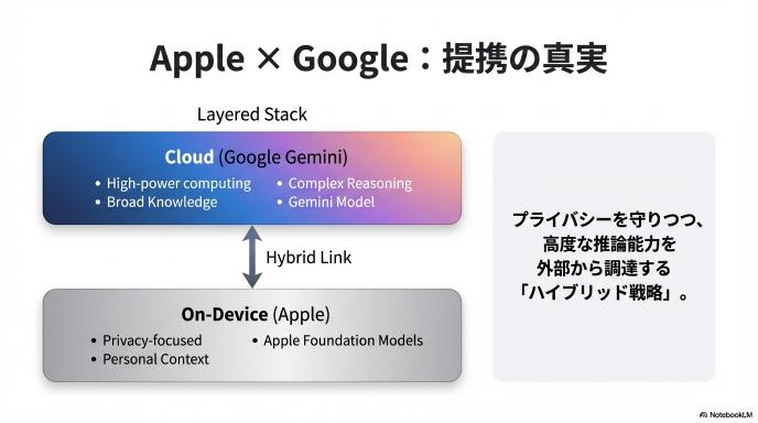 Appleは自社開発の基盤モデル(Apple Foundation Models)を放棄したわけではありません。プライバシーに関わるオンデバイス処理は自社で行い、広範な知識や高度な推論が必要なタスクにおいてGeminiのパワーを借りるという「ハイブリッド戦略」です。