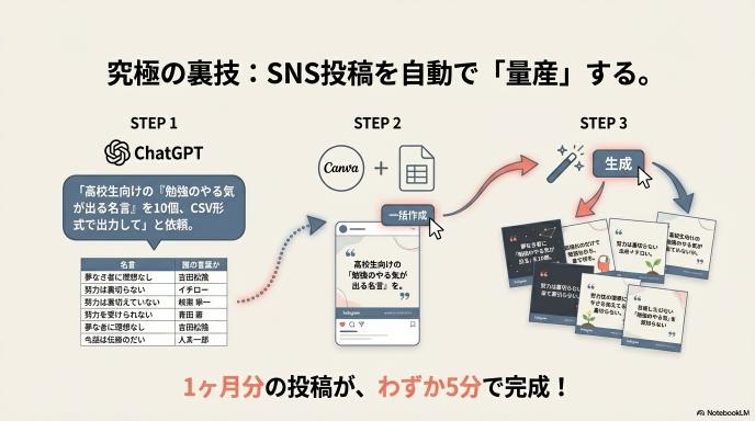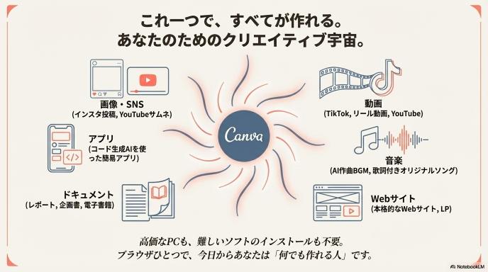 これら全部が、ブラウザ(SafariやChrome)ひとつで完結します。高いパソコンも、難しいソフトのインストールも必要ありません。スマホとCanvaがあれば、今日からあなたは「何でも作れる人」です。