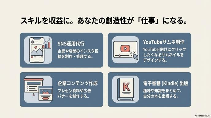 自信がついたら、ココナラやクラウドワークス、SNSで「サムネ作ります」「インスタ投稿代行します」と発信してみましょう。 最初は低単価でも、「Canvaでこんなに作れます!」というポートフォリオ(作品集)を見せれば、必ず依頼は来ます。