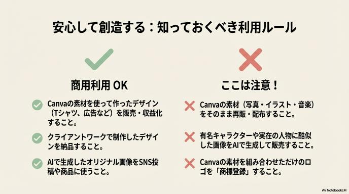 • NG: Canvaの素材(写真や音楽)を「そのまま」販売・配布すること。「俺が撮った写真だ」と言って売るのはダメです。