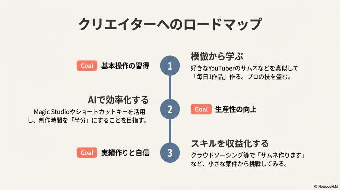 まずは1週間、毎日1つ何かを作ってみましょう。 おすすめは「好きなYouTuberのサムネを真似して作る(模写)」こと。 「この文字はどうやって目立たせているんだろう?」と考えながら真似することで、プロの技が自然と身につきます。