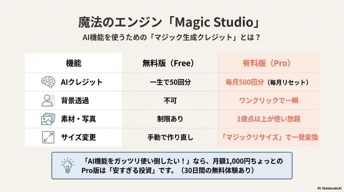 「Magic Studio(マジックスタジオ)」というAI機能群が超強力です。「背景を消す」「画質を良くする」「写真の続きを描き足す」といった魔法を使いたいなら、月額1,000円ちょっとのPro版は「安すぎる投資」と言えます。(※30日間の無料体験もあるので、そこで判断するのが賢いやり方!)