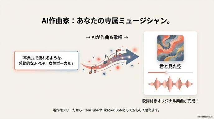 • 音楽生成AIと連携して、オリジナルのBGMや歌まで作れちゃう