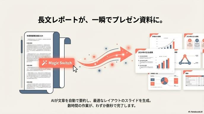 スライドはできたけど、何を話せばいいかわからない? 「Magic Write」に「このスライドの発表原稿を書いて」と頼みましょう。 生成された原稿は、プレゼン画面の「発表者ノート」(自分にしか見えないメモ)に貼り付けておけば、当日はそれを読むだけで完璧なプレゼンができます。