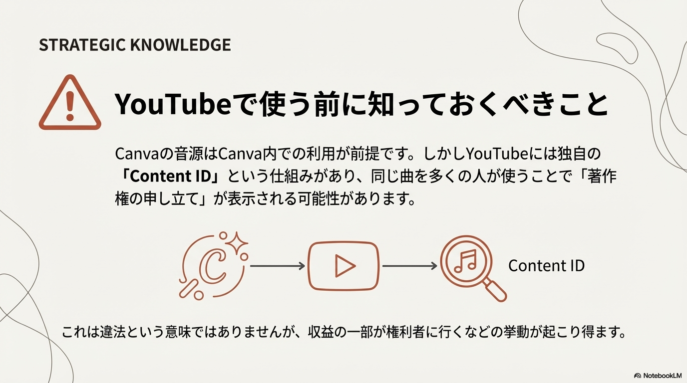 CanvaのオーディオライブラリやAI音楽は、Canva内での利用を前提にライセンスされていますが、YouTube側には独自の「Content ID」という仕組みがあります。