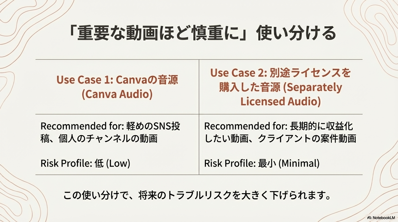 といった使い分けをしておくと、トラブルリスクを下げられます。 (※ライセンスの詳細は、[記事3:Canvaのライセンス解説]もあわせてご確認ください)