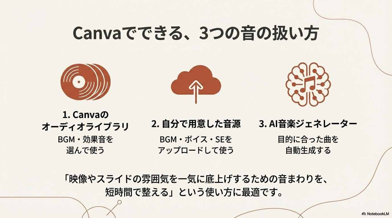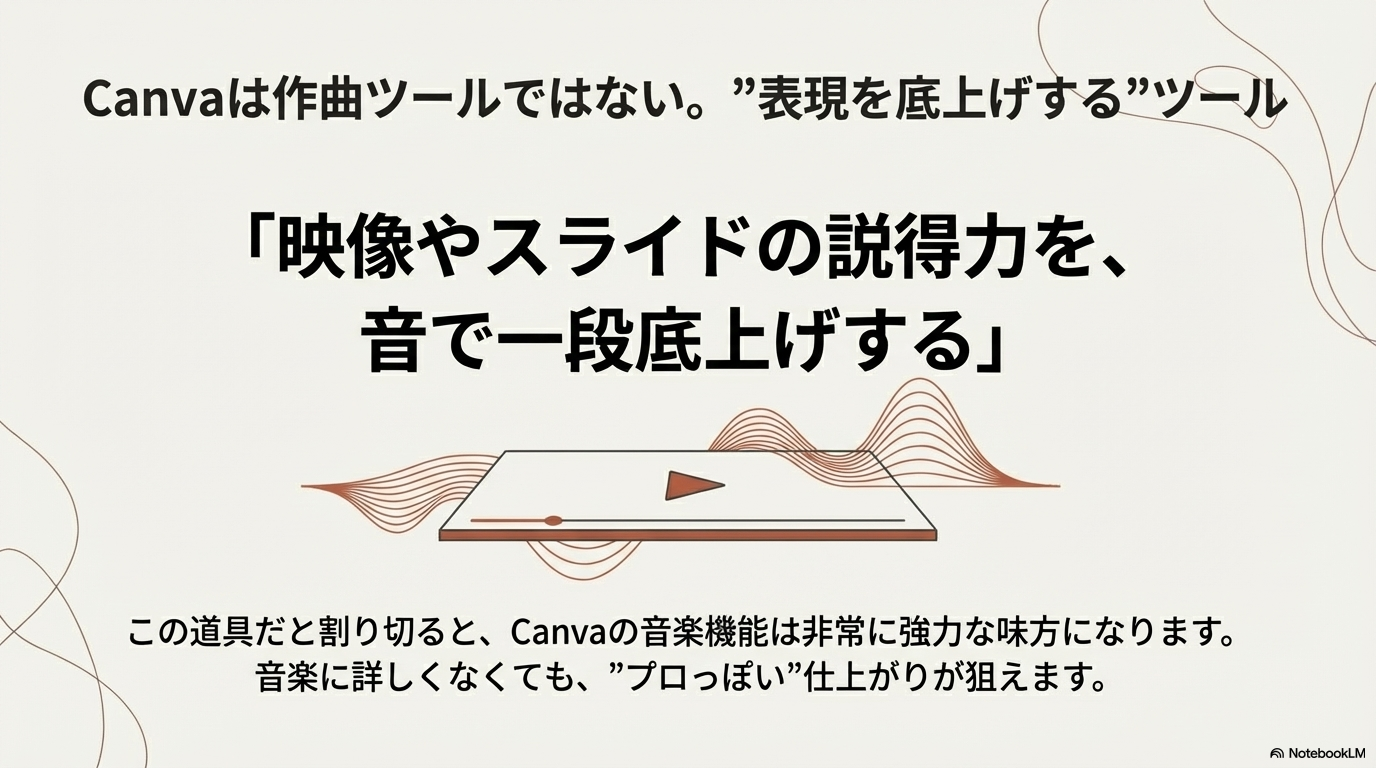 Canvaの音楽機能は、「曲をガチで作る」のではなく、「映像やスライドの説得力を、音で一段底上げする」ための道具だと割り切ると、非常に使いやすくなります。