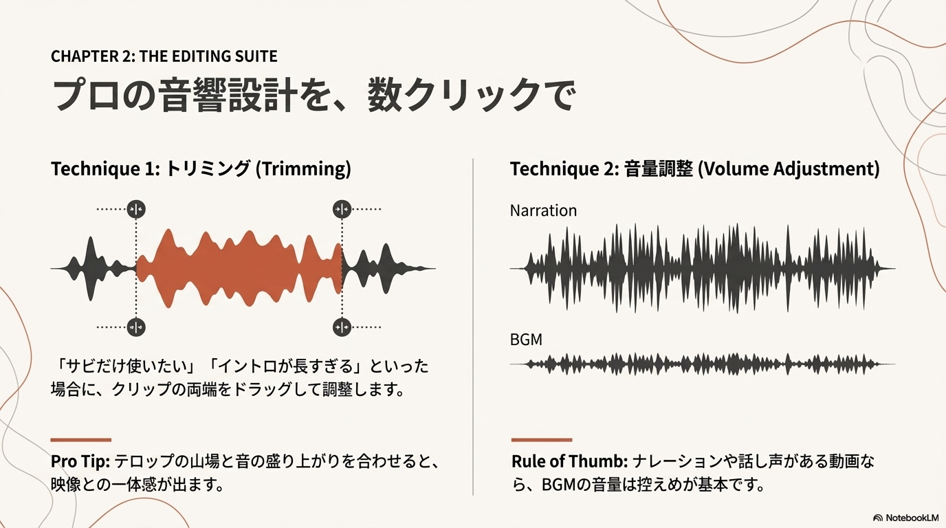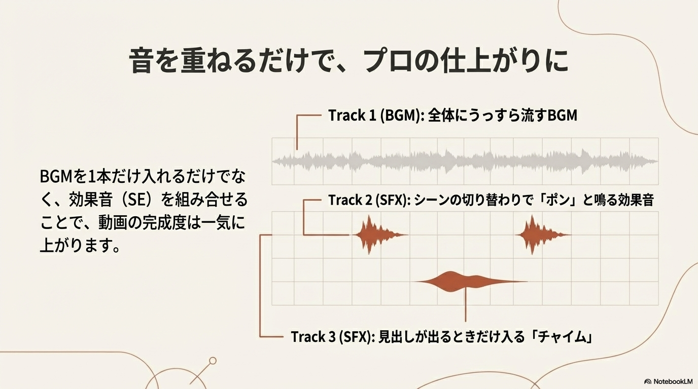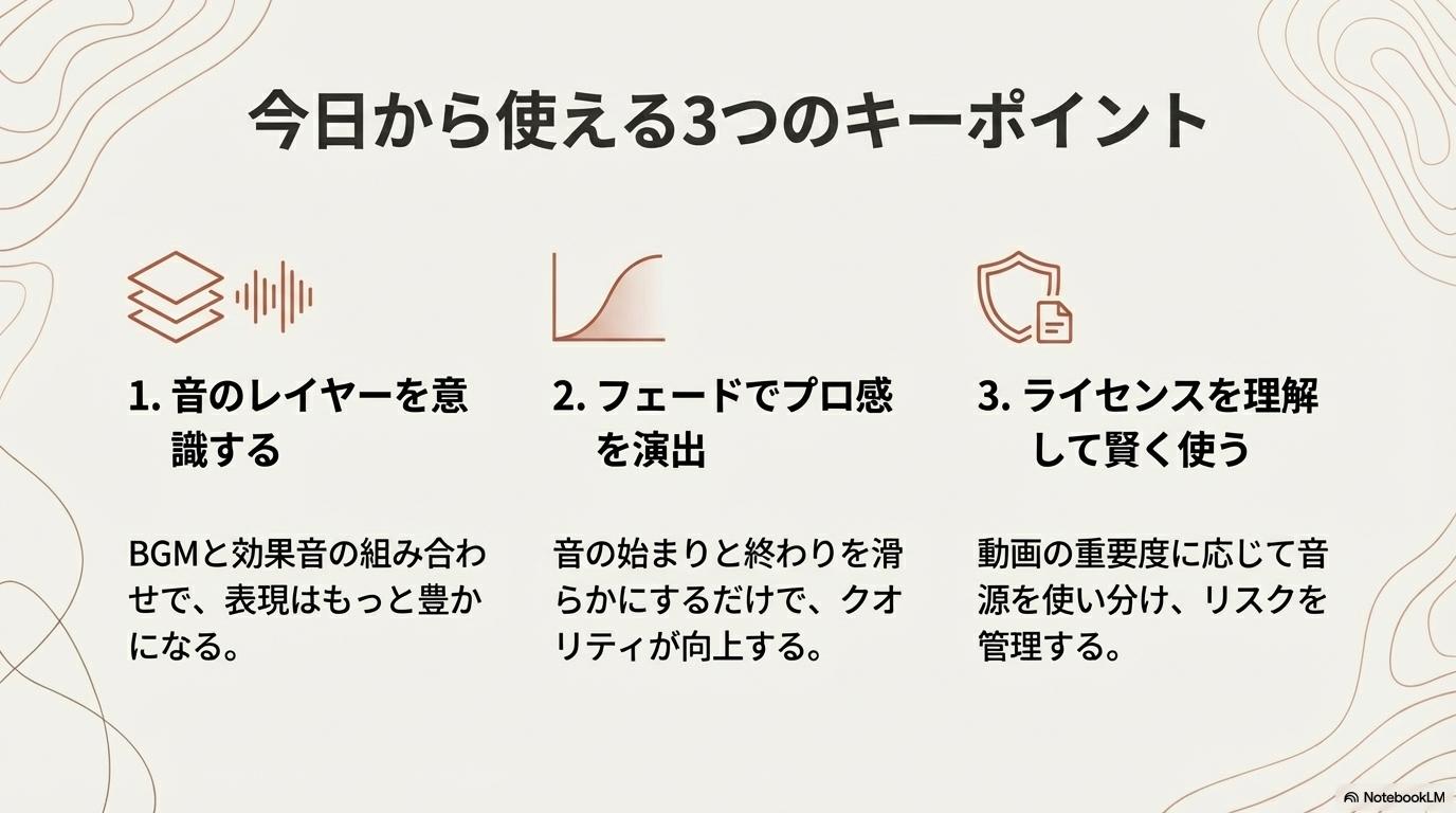 AI音楽、BGM、効果音をうまく足しながら、最後は「声やメッセージを邪魔していないか?」という視点で調整する。 このバランス感覚さえ持っていれば、音楽に詳しくなくても十分“プロっぽい”仕上がりが狙えます。