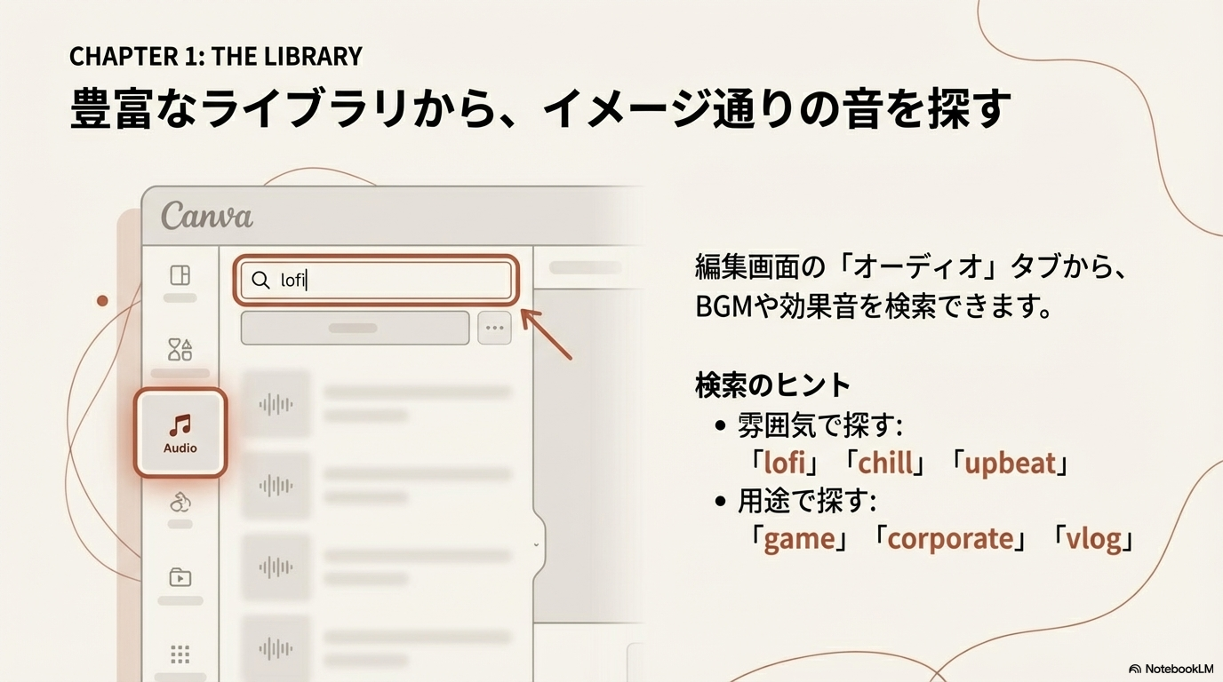 - CanvaのオーディオライブラリからBGM・効果音を選んで使う