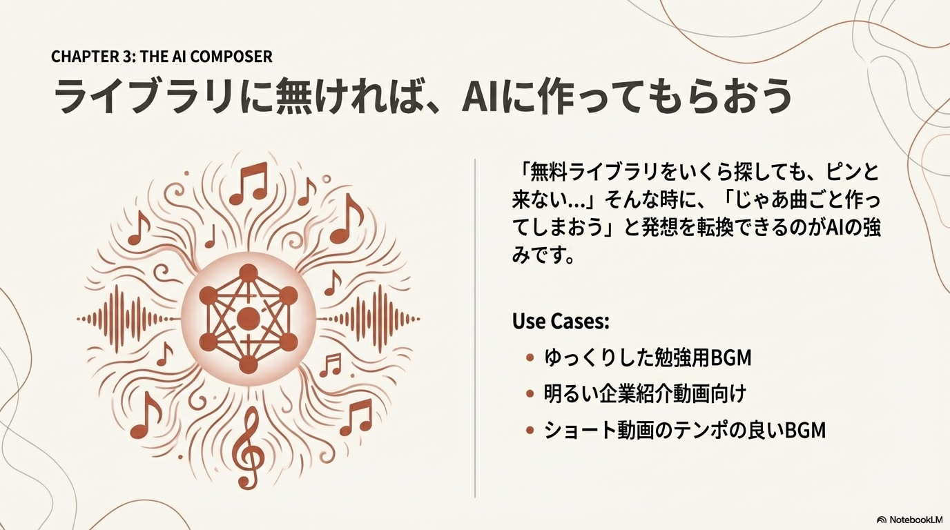 といったざっくりしたテーマでも、AIが曲を作ってくれます。「無料ライブラリをあさっても、ピンと来ない…」というときに、「じゃあ曲ごと作ってもらおう」と発想を変えられるのが便利なところです。